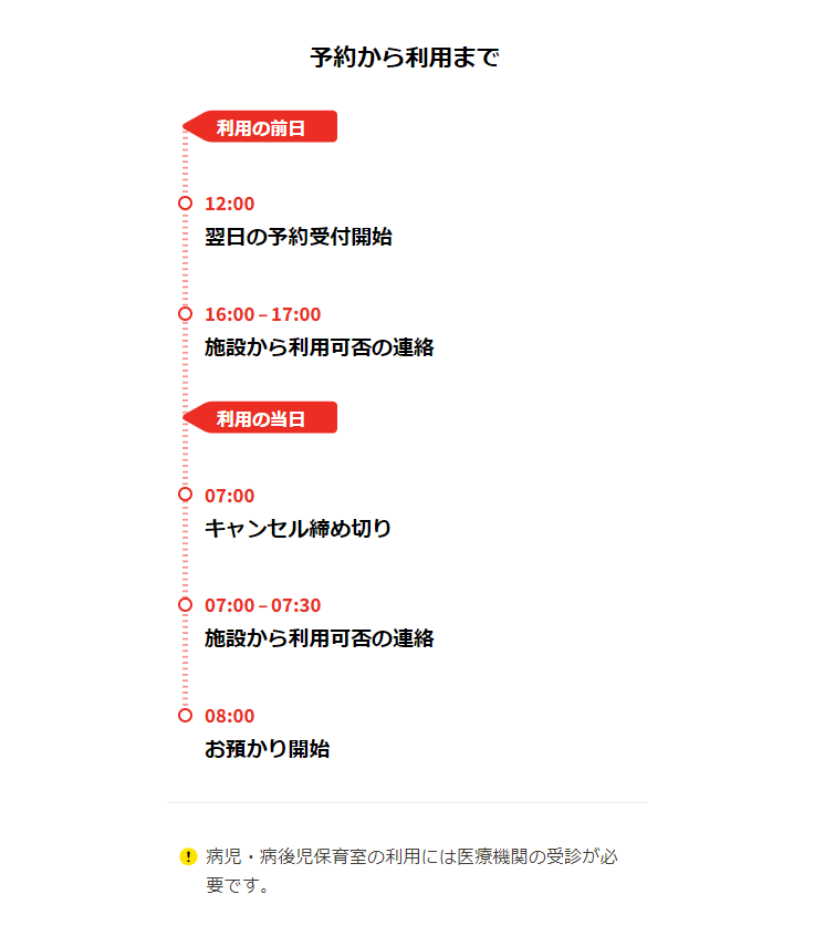 - 当日の朝7時までに、病児保育予約サービス「あずかるこちゃん」よりお願い致します。